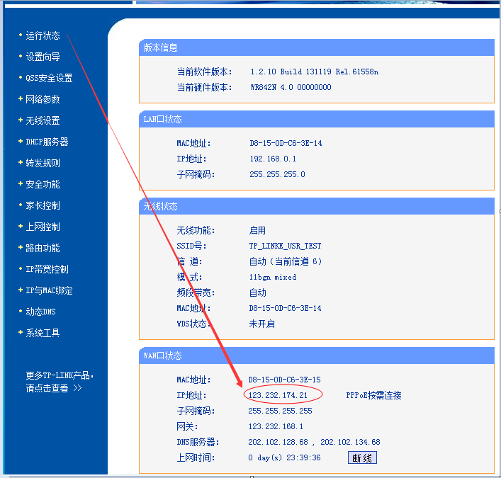 在瀏覽器上登陸路由器的設置網頁,在運行狀態下,檢查路由器的WAN口地址,檢查WAN口地址是否為公網IP,例如下圖IP是:123.232.174.21.
