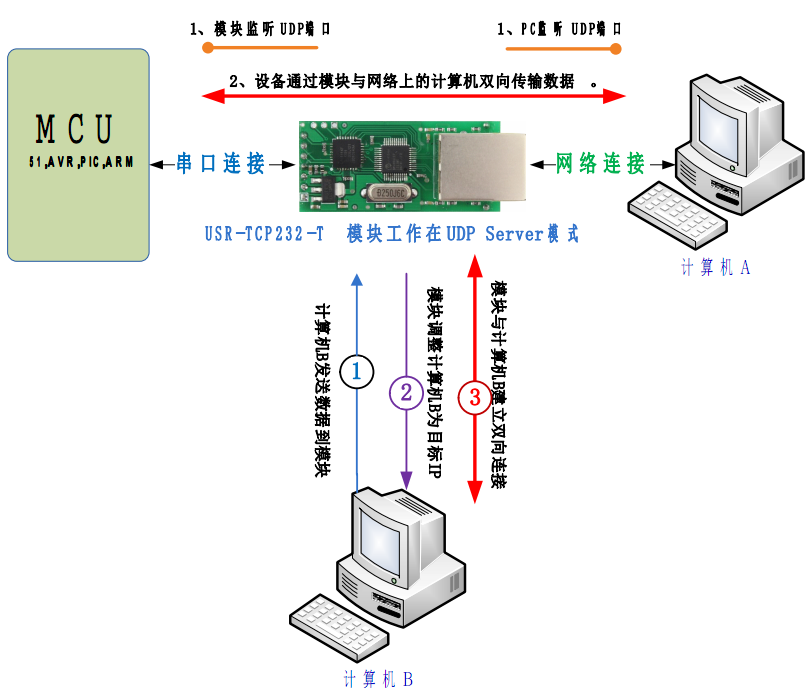 在此模式下,模塊默認記錄一個目標IP,當串口有數據時,向記錄的IP發送數據,同時,模塊處于服務器的地位,接收網絡中發給模塊的數據包,并隨時調整目標IP為數據來源的IP,適合于多個IP對應模塊的工作方式。使用計算機端的程序和UDP模式完全一樣,不需要任何更改。