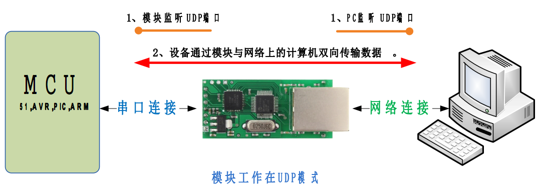 UDP client ,是指模塊通電后監聽設置的端口,不主動建立鏈接,當串口設備向模塊串口發送數據時,串口服務器 將數據發送到設定的目標IP和端口上,PC端可以將目標IP和端口設置為模塊的自身IP模塊的自身端口,然后PC端發送數據,可以將數據發送到模塊的串口端。
