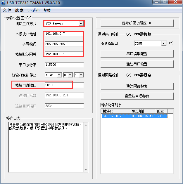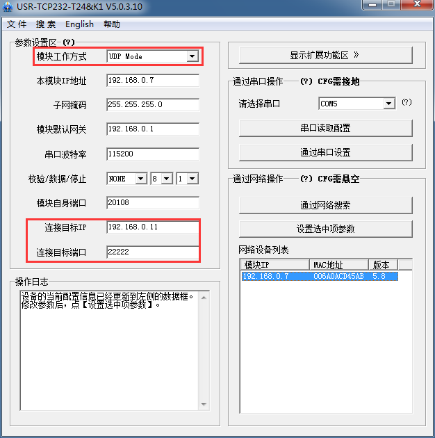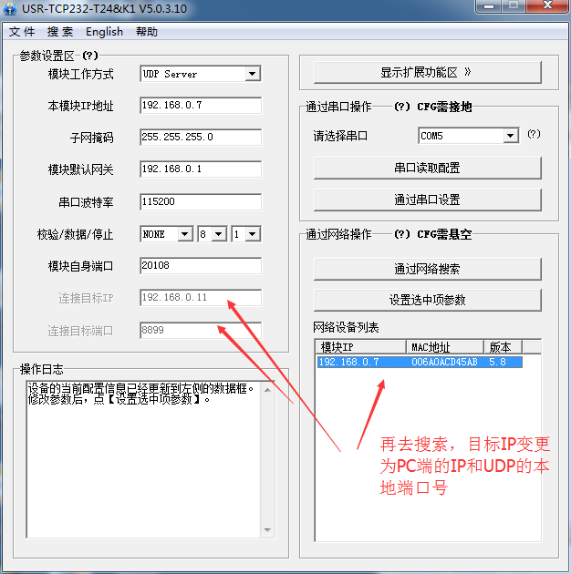 5:為了檢驗此功能,雙向發送數據測試成功以后,使用設置軟件搜索,然后查詢參數,發現目標IP和端口改成了192.168.0.11和8899