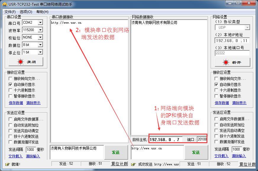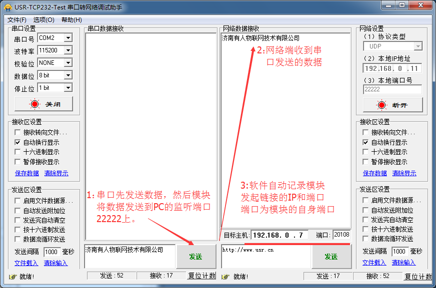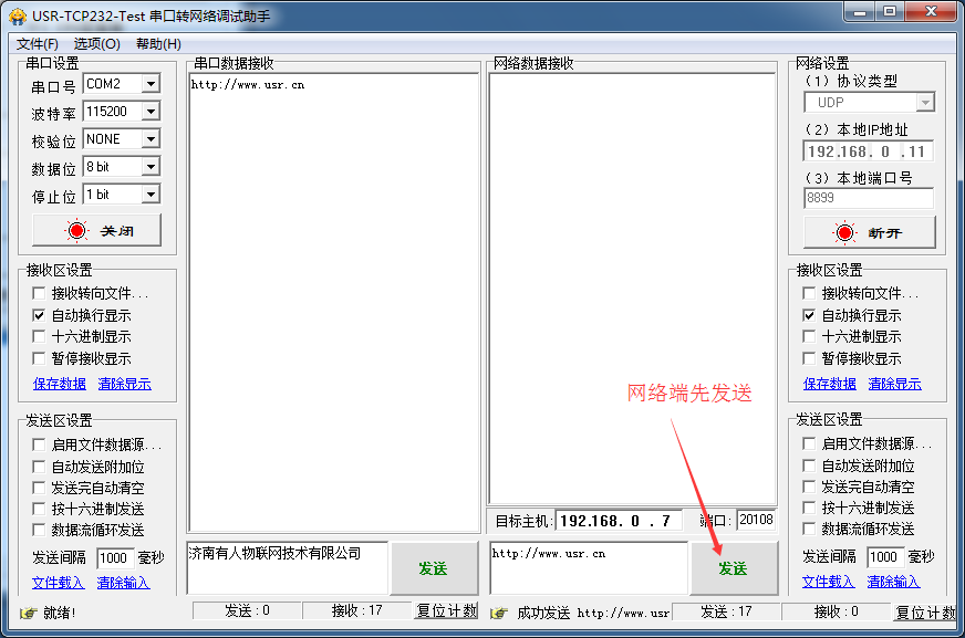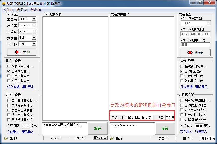 2:測試軟件說明。將串口服務器的串口連接到電腦的串口上,電腦串口號為com2. 設置軟件協議類型UDP ,本地IP為電腦自身IP192.168.0.11。端口設置一個8899.將目標主機IP和端口設置為以上設置參數的本模塊IP和模塊自身端口:192.168.0.7:20108.
