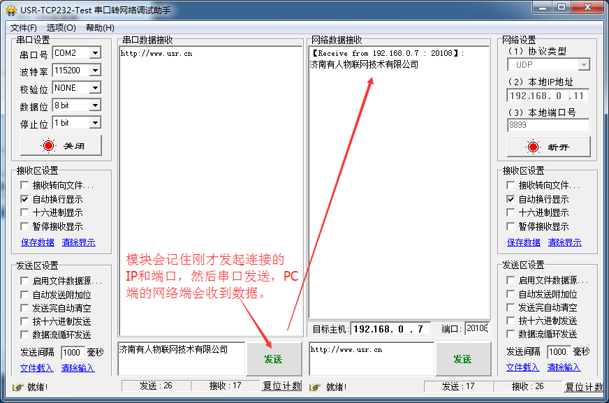 4:然后串口發送數據,模塊會自動記錄剛才發起連接的IP和端口,然后串口發送的數據就會自動向此端口發送。然后網絡端可以接收到數據。實現串口到網絡端口的UDP透傳。