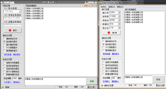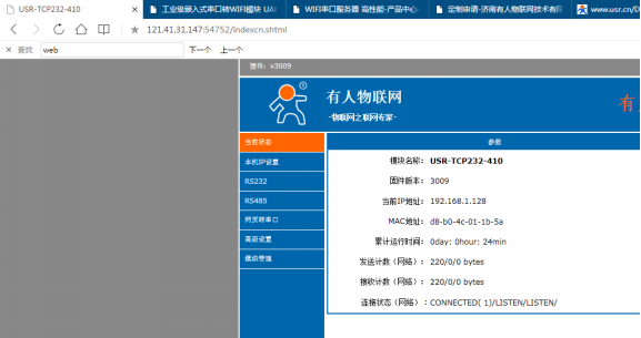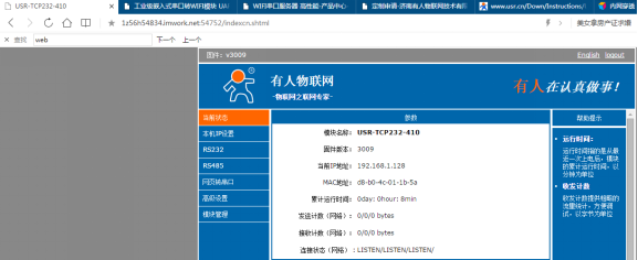 本文測(cè)試使用的網(wǎng)口設(shè)備為USR-TCP232-410S 實(shí)現(xiàn)的功能是訪問(wèn)410S內(nèi)置網(wǎng)頁(yè)及連接410S的TCP Server透?jìng)鲾?shù)據(jù)。410S的IP為192.168.1.128,網(wǎng)頁(yè)端口80,TCP Server監(jiān)聽(tīng)端口23。
