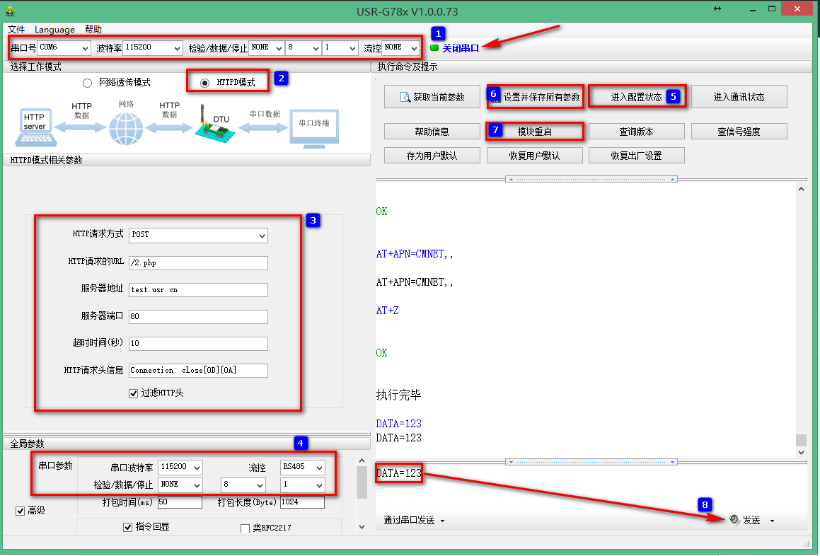 實現功能:實現串口設備發送數據,通過USR-G780模塊,可以直接發送到網頁服務器上,網頁服務器可以接收數據,對數據進行判斷存儲等操作,web服務器根據串口設備請求數據,反饋相應的控制指令。