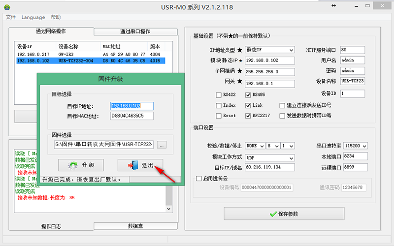 將電腦和M0產(chǎn)品直接網(wǎng)線對接,設(shè)置電腦IP和M0在同一個(gè)網(wǎng)段,使用配置軟件搜索設(shè)備后升級固件,升級完成后點(diǎn)擊“恢復(fù)出廠設(shè)置”才能正常使用。
