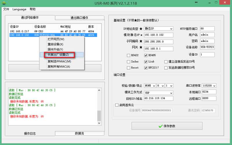 5、右擊搜索到的M0產(chǎn)品,選擇“恢復(fù)出廠設(shè)置”,升級完成。