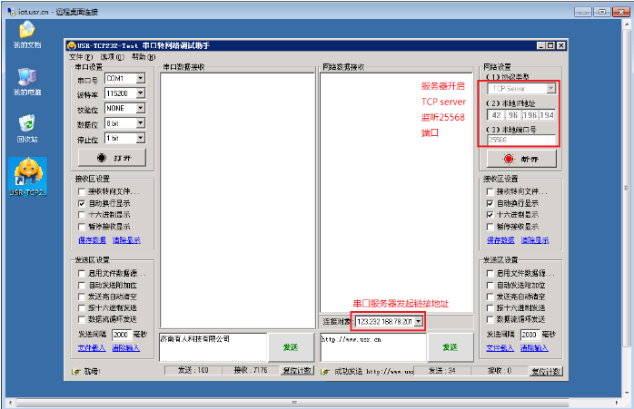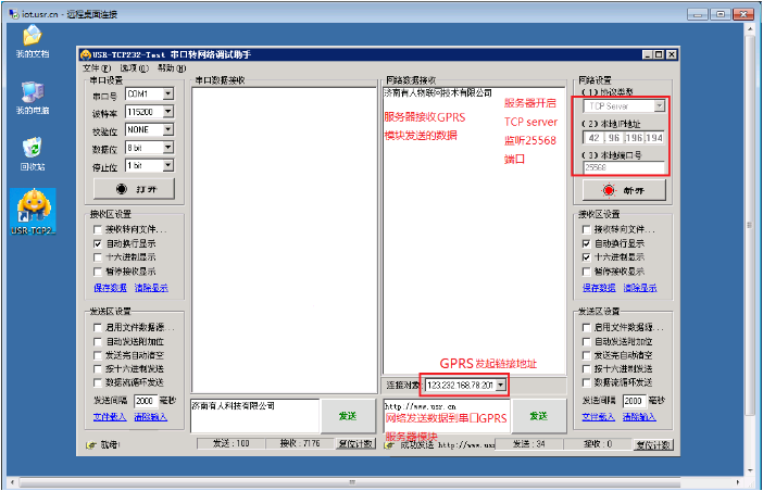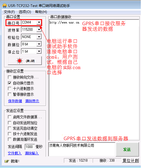 以上是服務(wù)器發(fā)送數(shù)據(jù)和接收數(shù)據(jù):以下使用電腦串口連接GPRS-DTU串口,電腦運行串口調(diào)試軟件,進(jìn)行發(fā)送和接收服務(wù)器的數(shù)據(jù)。