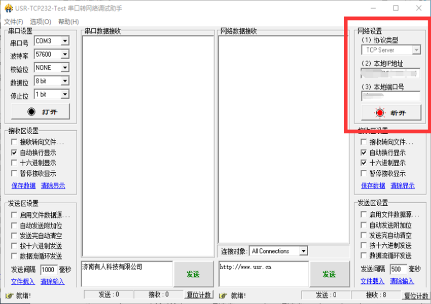 4、重啟后,在串口發送區發送數據,此時在服務器上可以接收到串口發送的數據,如圖