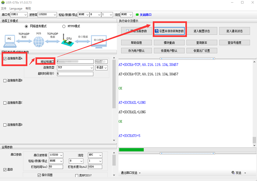 3、勾選連接服務器A,地址設置為公網服務器的公網IP,端口號為服務器上上位機軟件的端口號。點擊“設置并保存所有參數”,如圖