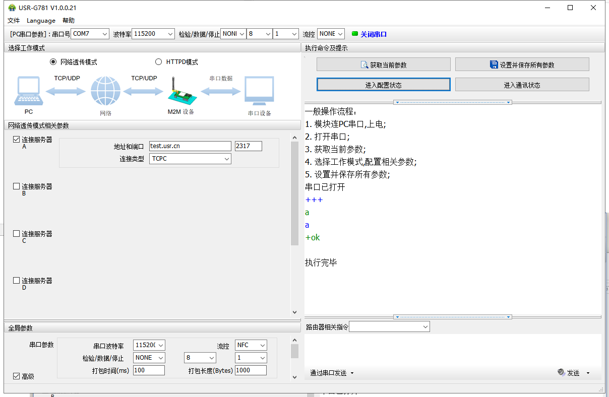如下,打開串口,點(diǎn)擊進(jìn)入配置狀態(tài),返回OK則表示成功進(jìn)入配置狀態(tài)。