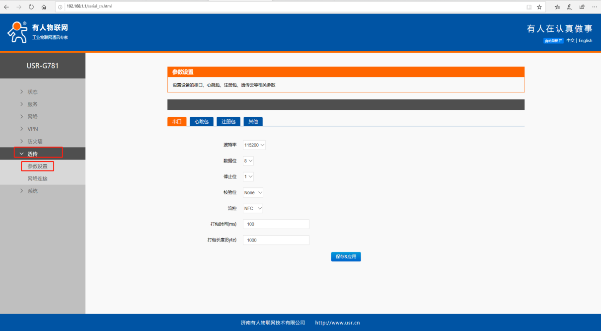 2. 在內(nèi)置網(wǎng)頁--透傳--參數(shù)設(shè)置中查看