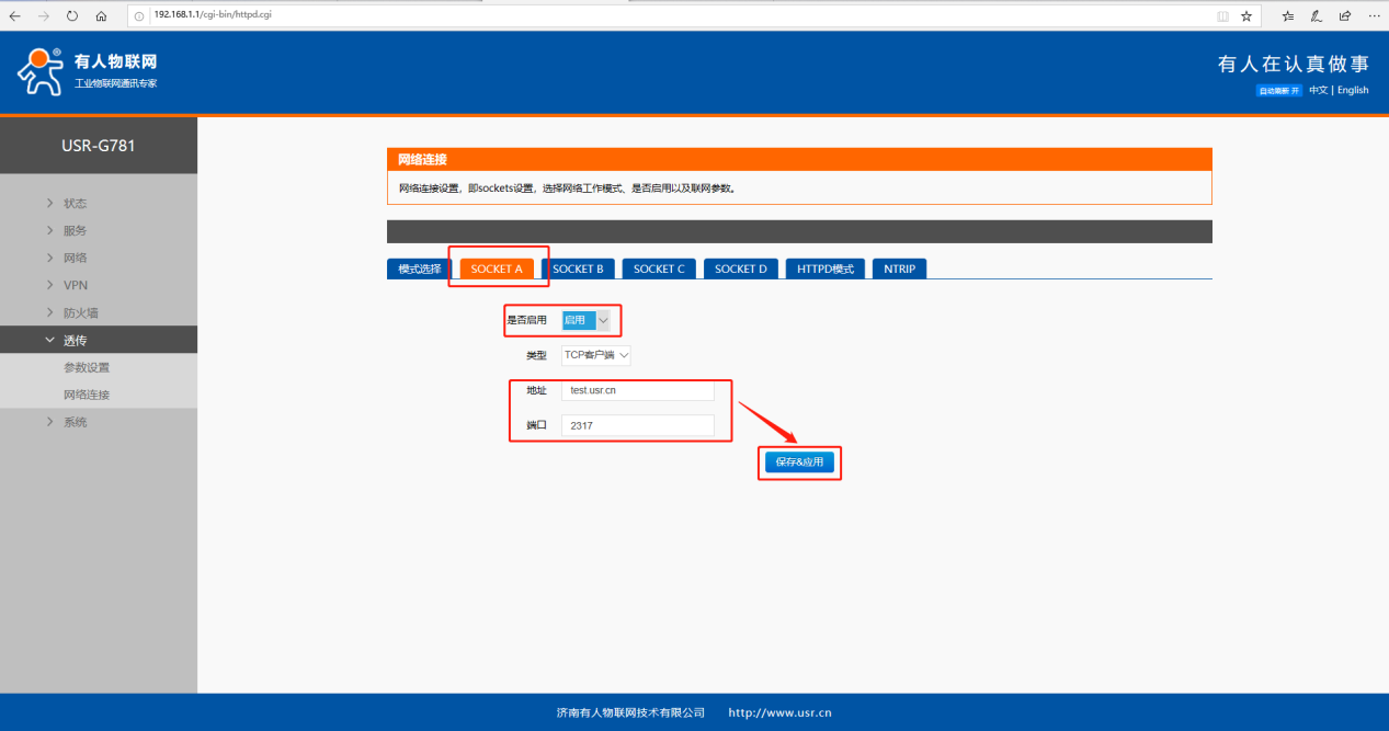 2>選擇SOCKETA,啟用,設(shè)置地址和端口為test.usr.cn,2317,保存并應(yīng)用