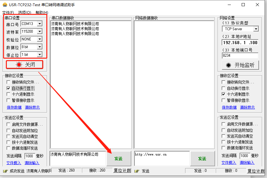 在發(fā)送區(qū)填寫數(shù)據(jù),點(diǎn)擊發(fā)送,則可在接收區(qū)域接收到服務(wù)器的返回