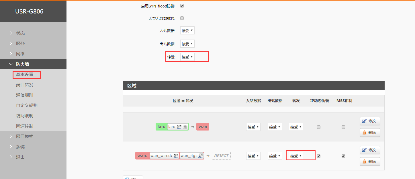 5,在防火墻基本設置內將所有拒絕設置為接受。