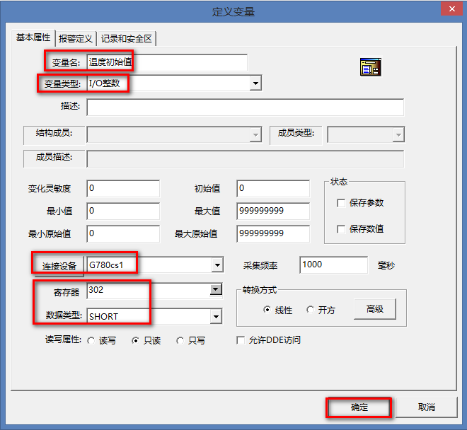 (2)新建變量:溫度初始值,選擇變量類型:IO 整數,連接設備為新建的設備名:G780cs1,寄存器302,代表功能碼為04,起始地址0的第二個值。