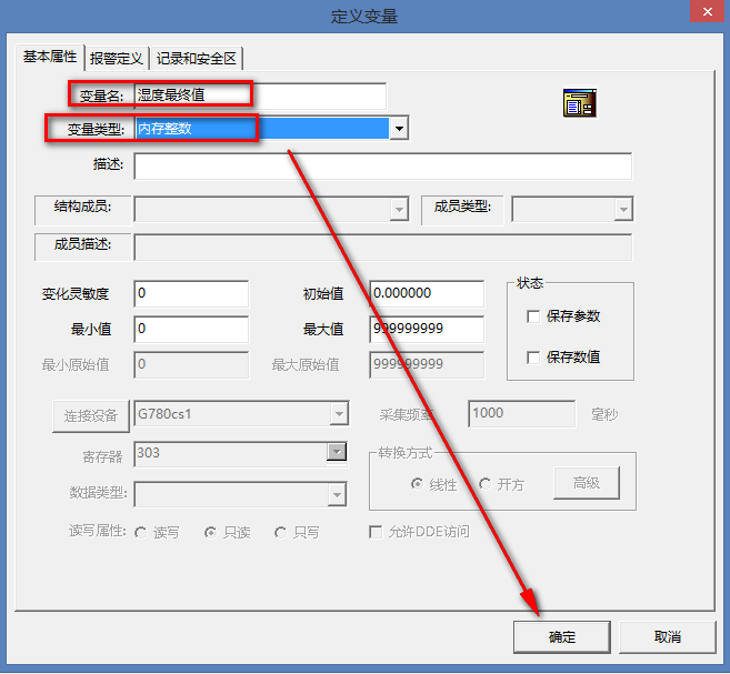 (1)新建變量名:濕度初始值,選擇變量類型:IO整數,連接設備為新建的設備名:G780cs1,寄存器301,代表功能碼為04,起始地址0的第一個值。