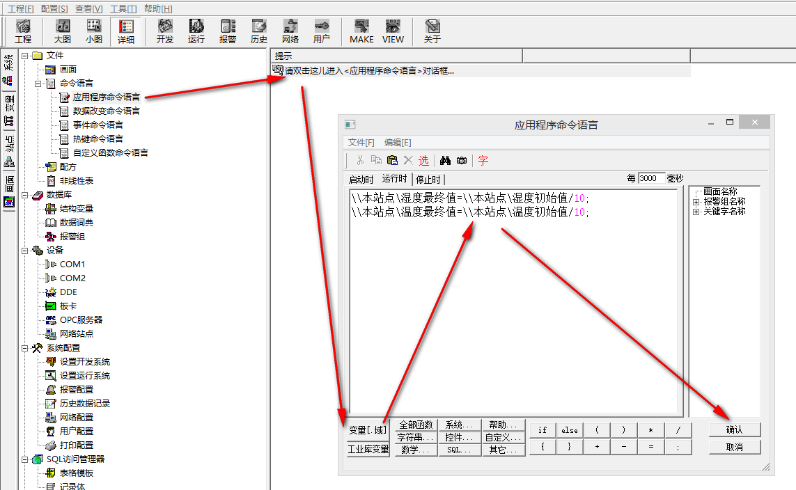 4.7點擊“命令語言”中的“應用程序命令語言”,然后輸入算法,“濕度初始值”采集到的數據除以10,然后將數據賦值給“濕度最終值”,此變量對應的是實際的濕度值。“溫度初始值”采集到的數據除以10,然后將數據賦值給“溫度最終值”,此變量對應的是實際的溫度值。