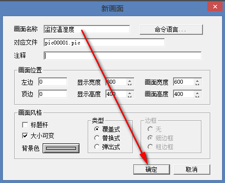 4.8點擊“畫面”,新建一個畫面,畫面名為監控溫濕度,點擊“確定”,進入畫面編輯欄。