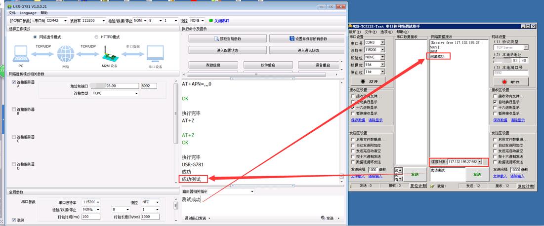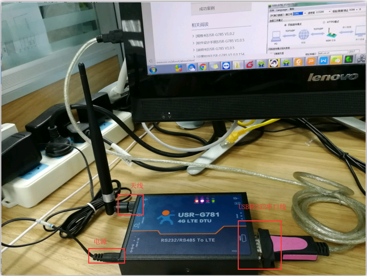 781串口通過USB轉232/485接到電腦端,裝上sim卡,接上天線,上電。