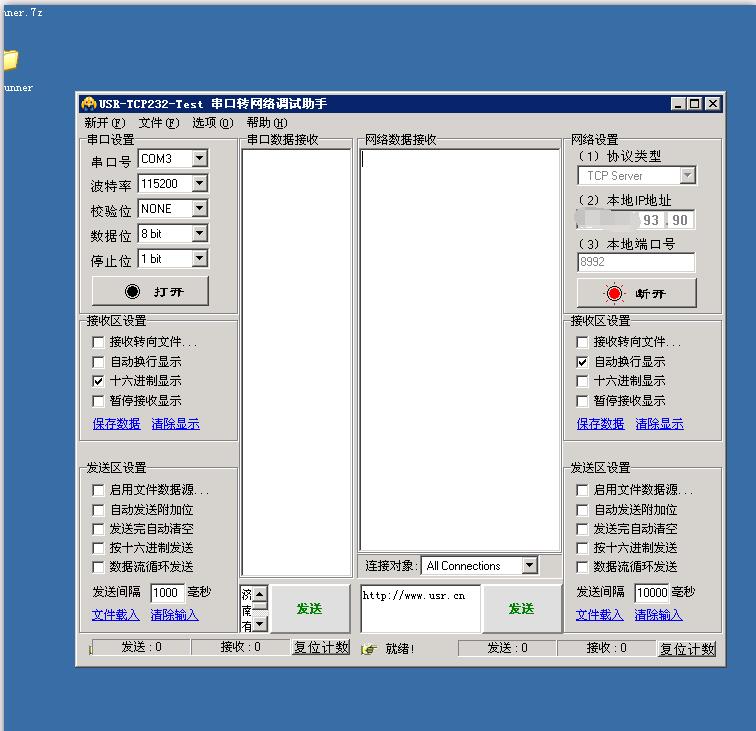 1. 先在服務器端打開一個網絡調試助手,設置成TCP server及本地端口號(在該案例中我設置的是8992),開始監聽