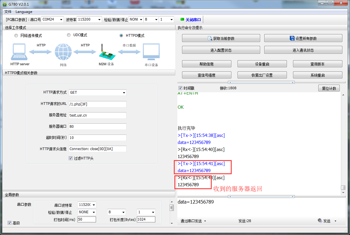 (1) 硬件連接:裝上sim卡,接上天線,780 V2的串口通過UAB轉RS232/485接到PC上,用我司提供的適配器供電。