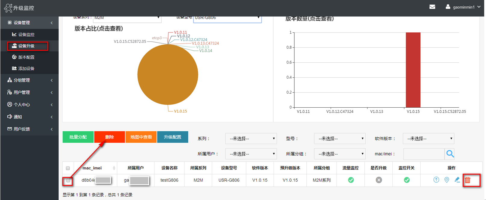 點擊“設備升級”,對于要刪除的設備,勾選前面的選擇框然后點擊“刪除”,或者是直接點擊垃圾桶圖標進行刪除設備