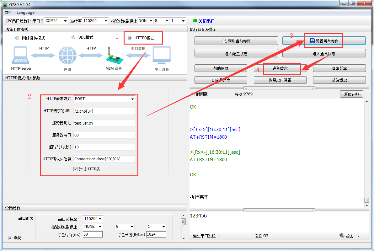 (1) 硬件連接:裝上sim卡,接上天線,780 V2的串口通過UAB轉RS232/485接到PC上,用我司提供的適配器供電。