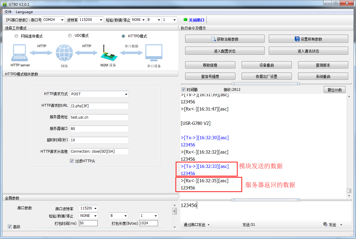 數據測試:我司的http服務器也是收到串口發送的數據后,將數據原封不動的再返回給串口設備,從下圖可以看出,通過串口發送123456,服務器也返回了123456