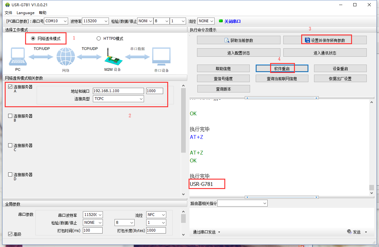 (3)設置參數。設置工作模式為“網絡透傳模式”,勾選鏈接服務器A,填寫PC的IP和監聽端口,鏈接類型選擇TCPC,即TCP Client。設置完參數點擊“設置并保存所有參數”,執行完畢后,點擊軟件重啟,待串口打印啟動信息,如“USR-G781”,代表設備重啟完畢。