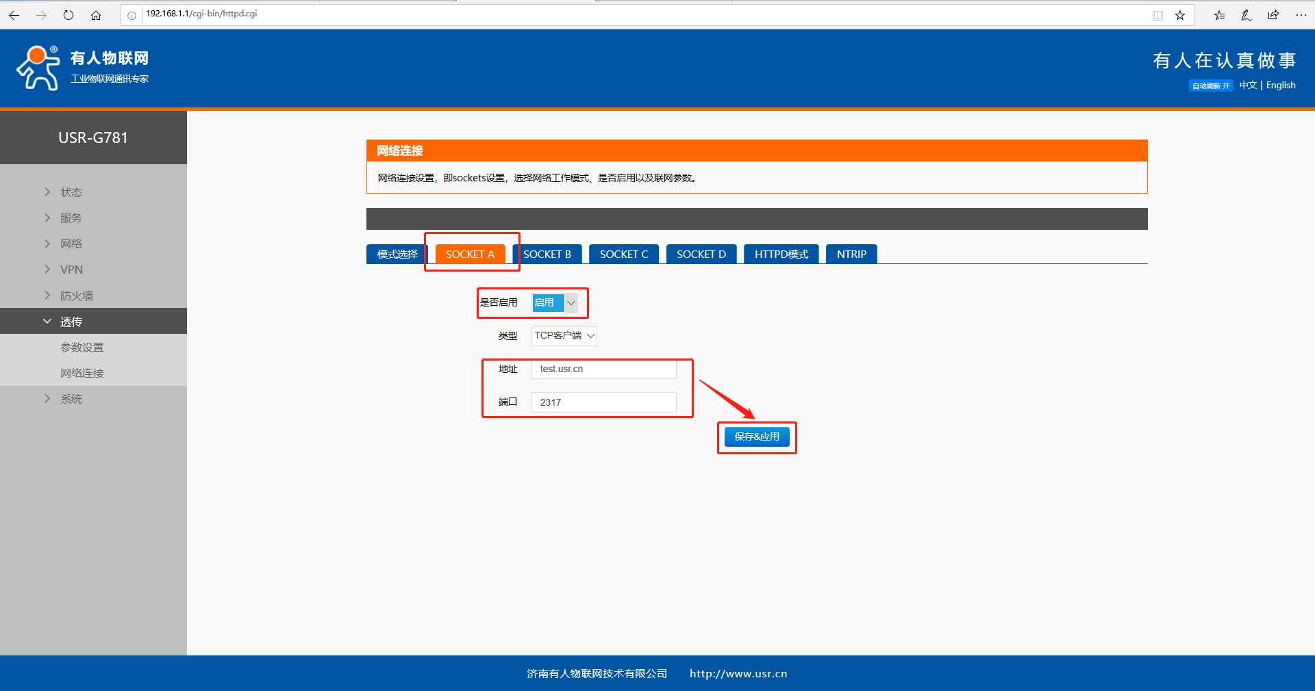 選擇SOCKETA,啟用,設置地址和端口為192.168.1.100:1000,保存并應用