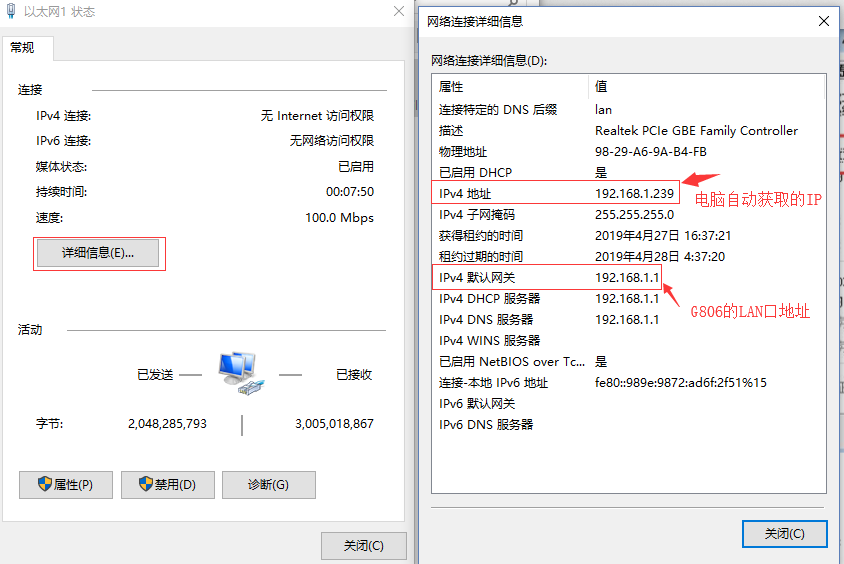 2、雙擊該網(wǎng)卡,顯示詳細(xì)信息,查看電腦獲取的IP