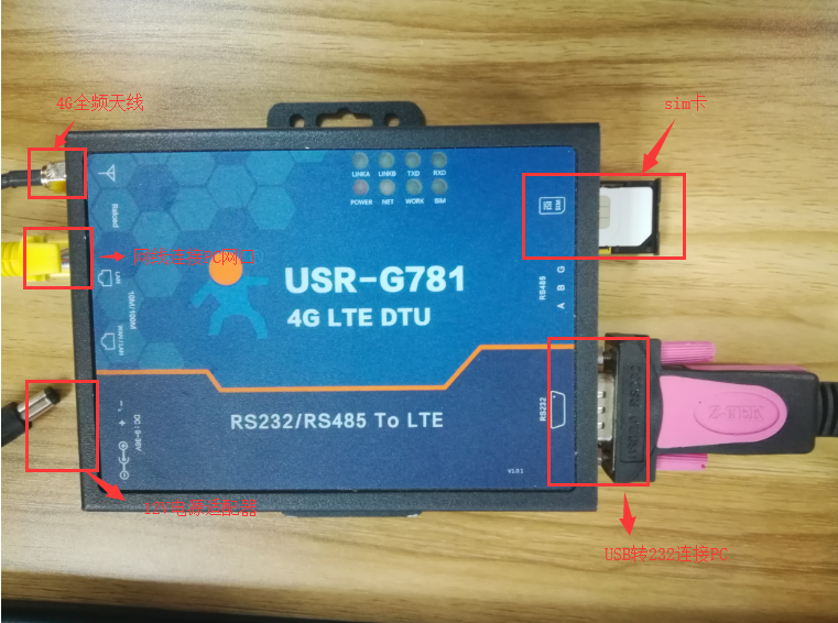 用USB轉串口線將G781的232串口連接到電腦,正確安裝天線,用我司配套電源適配器鏈接供電。如下圖所示: