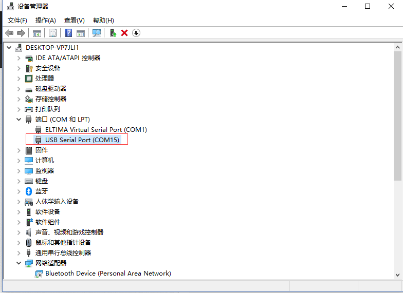在設備管理中能夠檢測到對應的串口,如下如所示,在我的電腦上檢測到串口為COM15(若未檢測到串口或者第一次使用該串口線,可以先用驅動精靈等軟件修復一下串口驅動。)