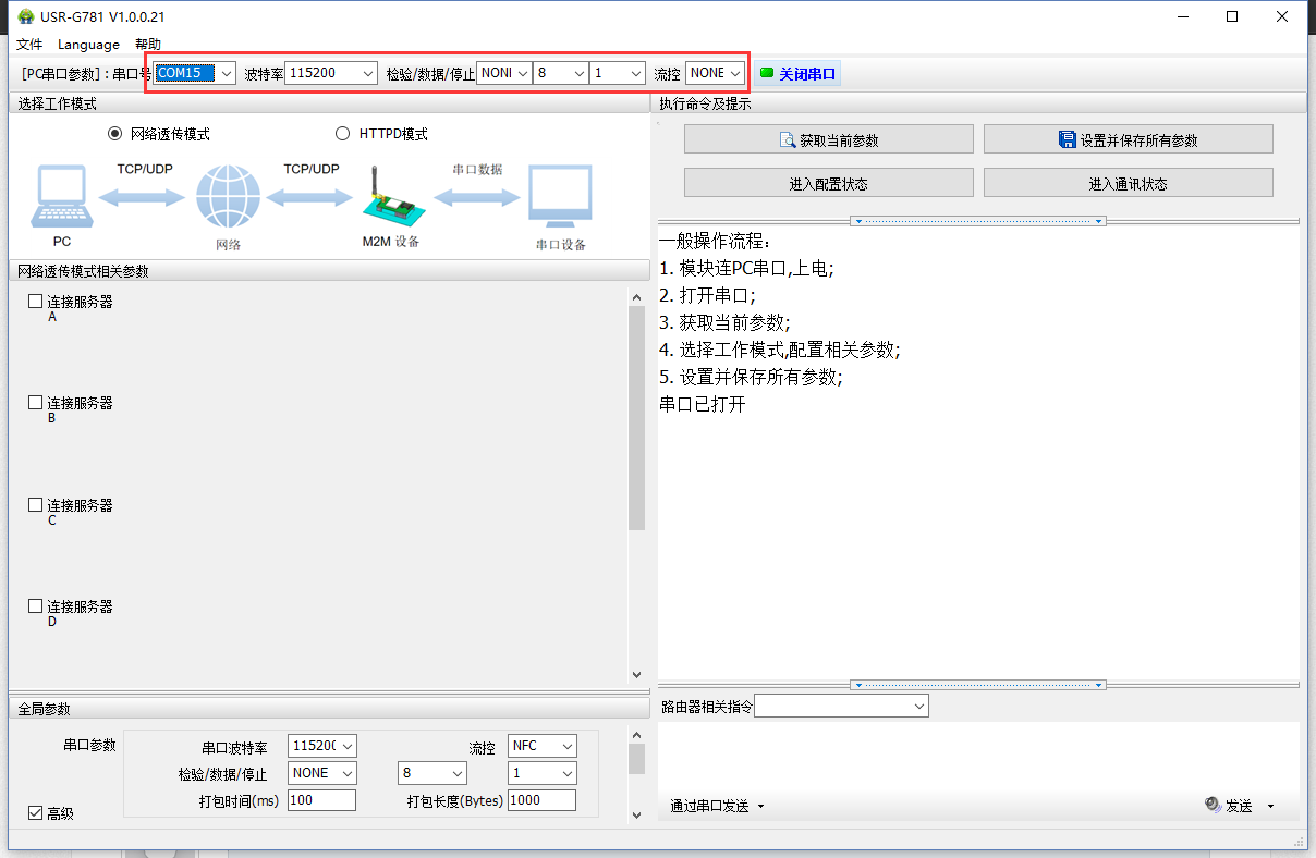 打開配置軟件 G781出廠默認串口參數:波特率115200,檢驗/數據/停止:NONE/8/1.如下圖所示,打開串口:
