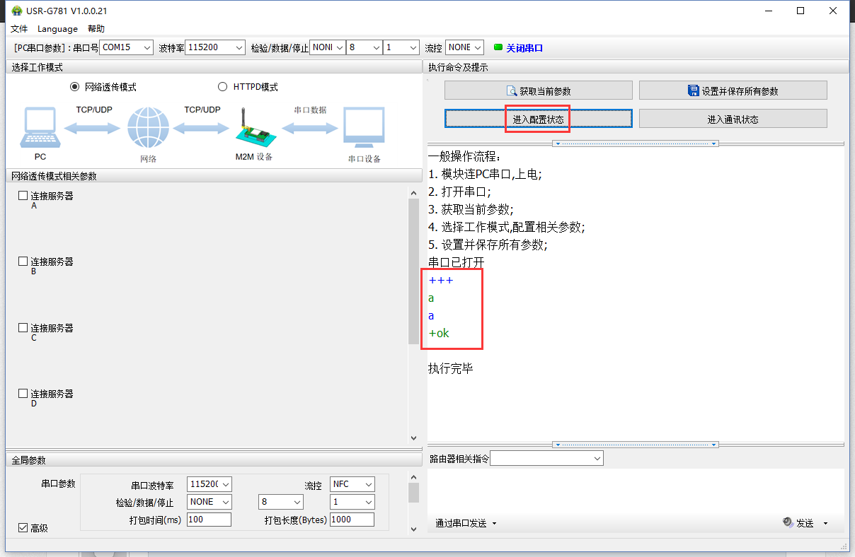 點擊進入配置狀態。若如下圖所示打印+++ a a OK,則表示正確進入配置狀態。若未顯示如下圖所示打印信息,可能原因: