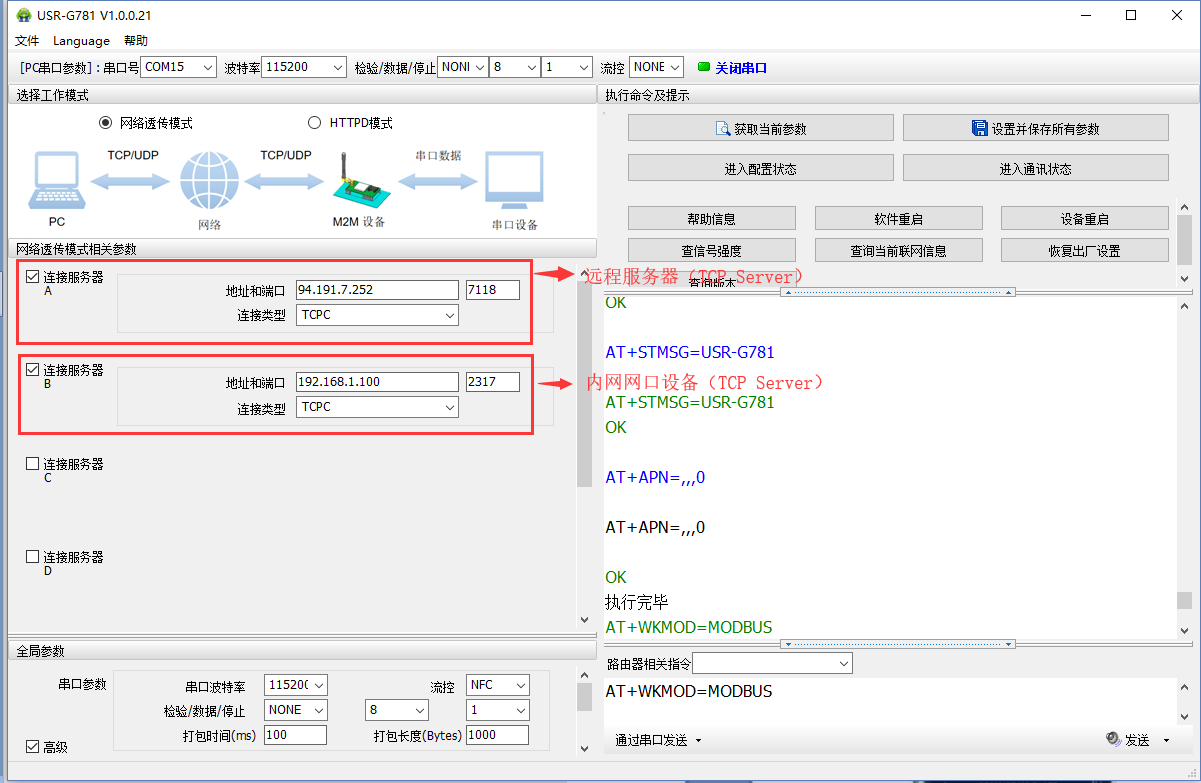 工作模式:透傳模式 ,服務器A地址和目標端口設置為某個遠程服務器,如:94.191.7.252、7118.
