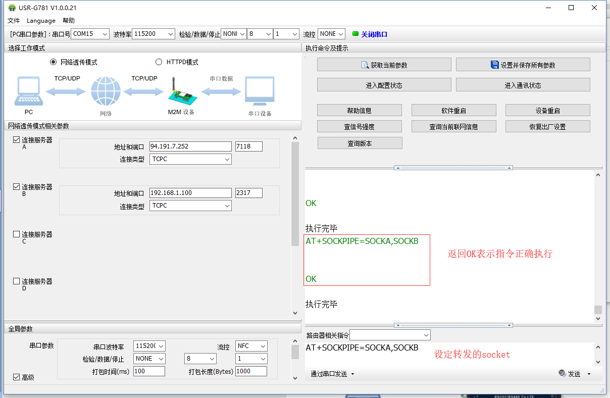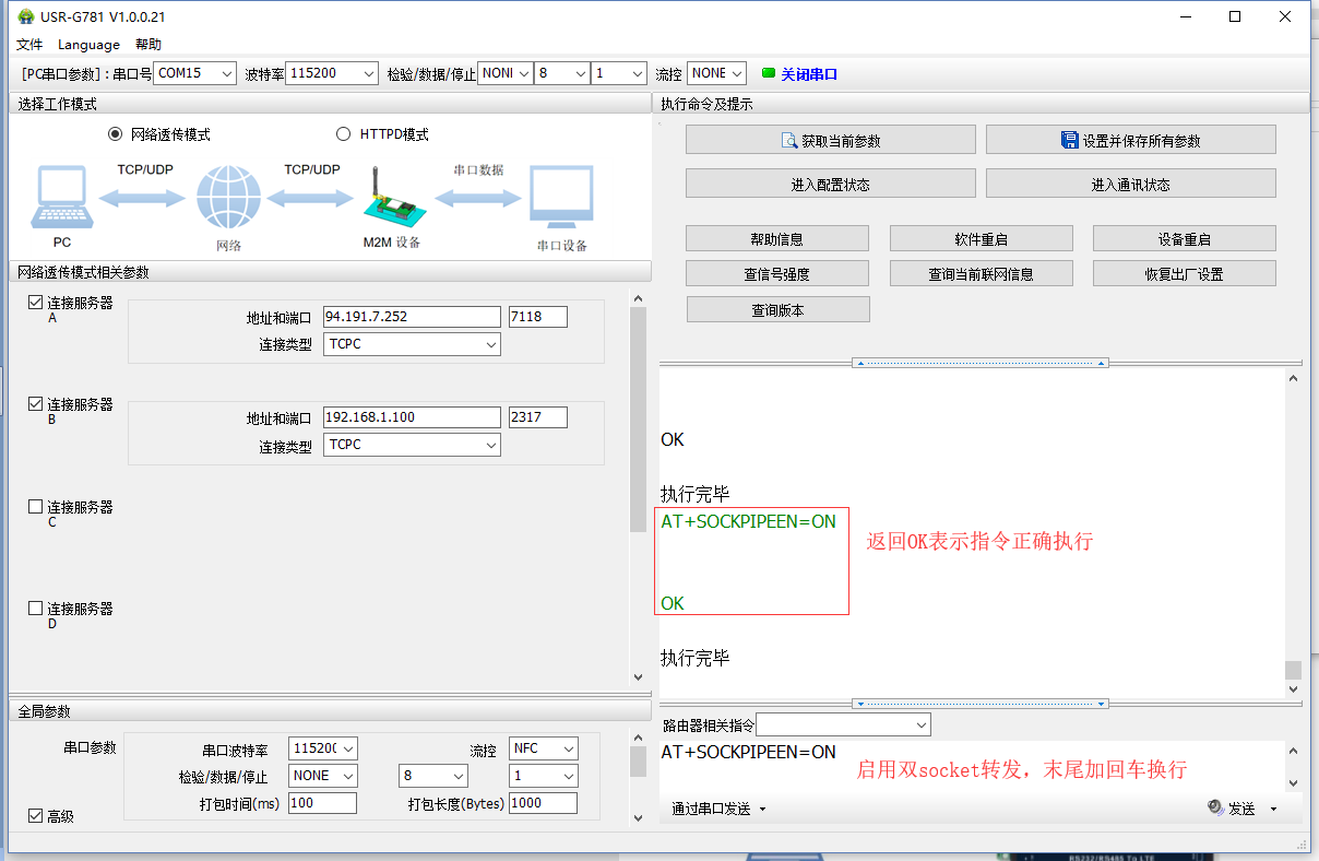 開啟雙socket轉發功能(AT指令要以回車換行結尾)