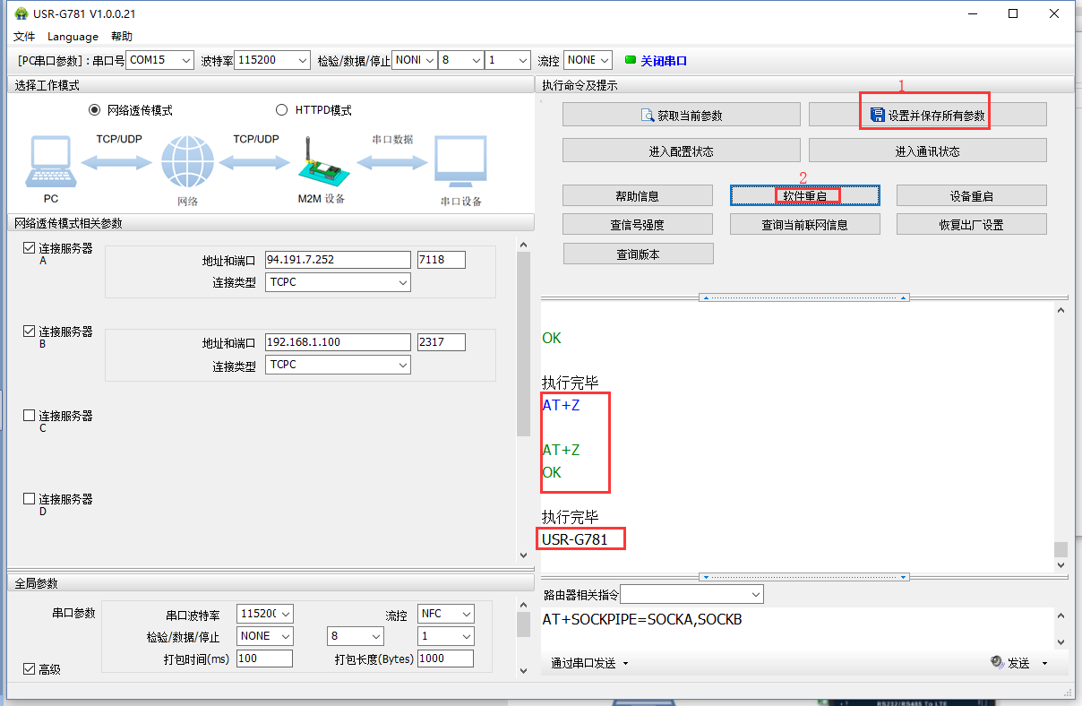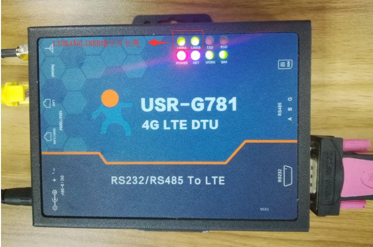 設置并保存所有參數,并重啟,待串口打印啟動信息USR-G781,表示啟動完成,這時將電腦的端口監聽打開,G781的linkA和linkB指示燈會亮起來,表示兩路socket成功建立并連接。