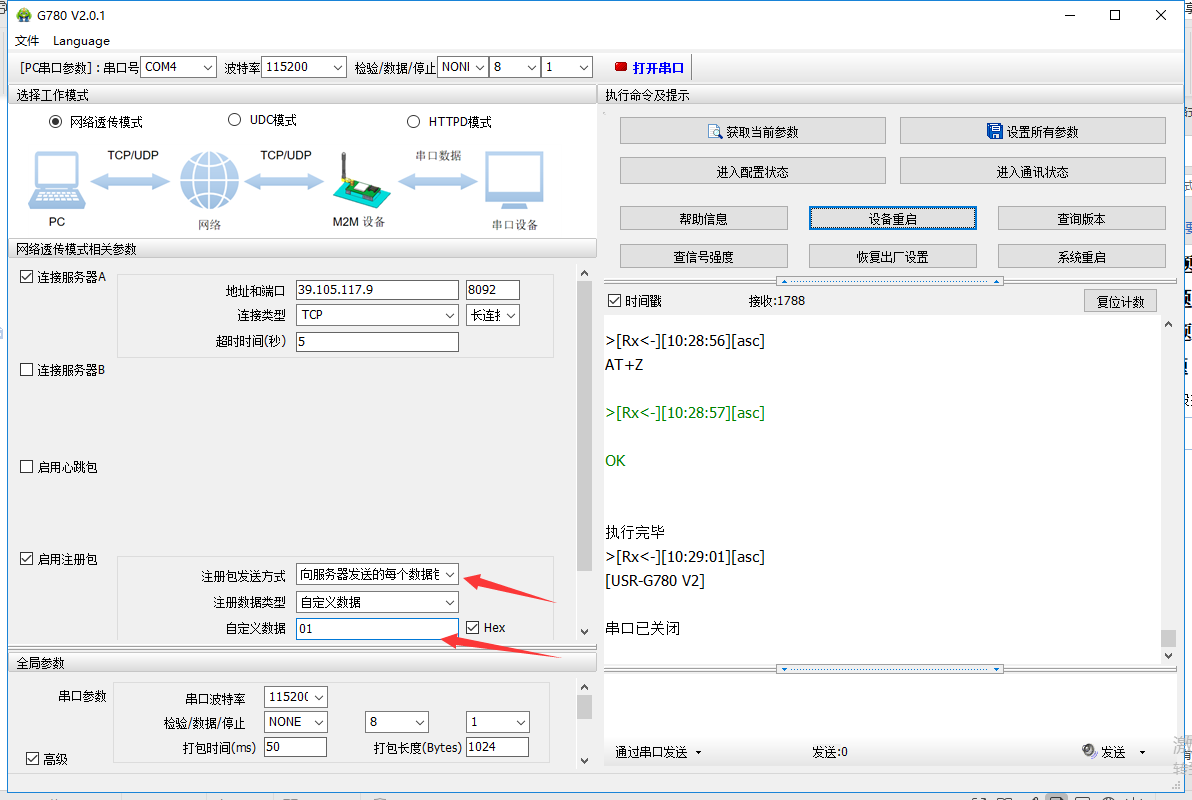 注:本案例中將注冊包自定義為01和02,用戶在真正使用過程中可以將注冊包數(shù)據(jù)定義為任意數(shù)據(jù),數(shù)據(jù)可設置最大長度依照具體設備的軟件設計手冊描述為準。