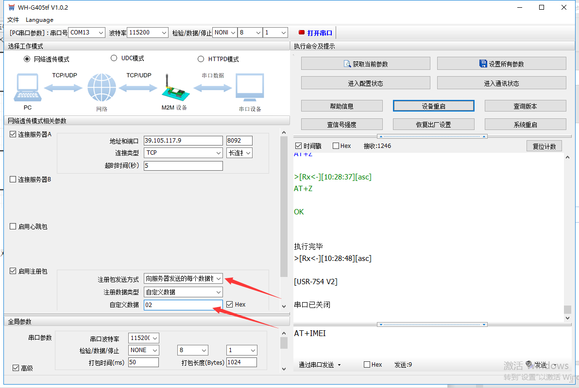 對DTU2進行配置,點擊進入配置狀態(tài)后,配置截圖見圖2(2),將啟用注冊包勾選上,注冊包發(fā)送方式選擇為向服務器發(fā)送的每個數(shù)據(jù)包前都加上,注冊數(shù)據(jù)類型選擇為自定義,數(shù)據(jù)填寫為02,如圖2(2)。