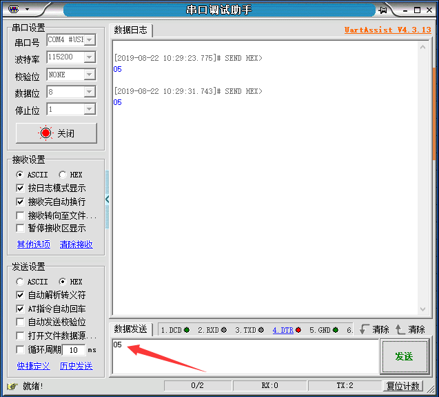 DTU2發(fā)送數(shù)據(jù)截圖,發(fā)送數(shù)據(jù)為05,(所設注冊包為02)如圖4(2)所示: