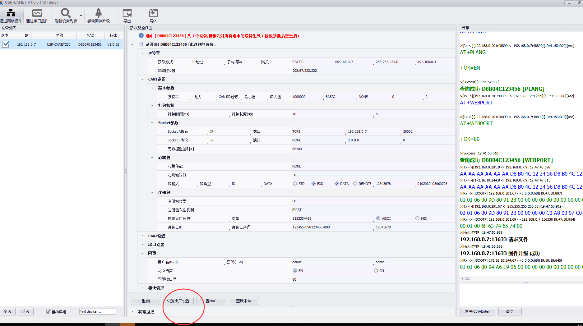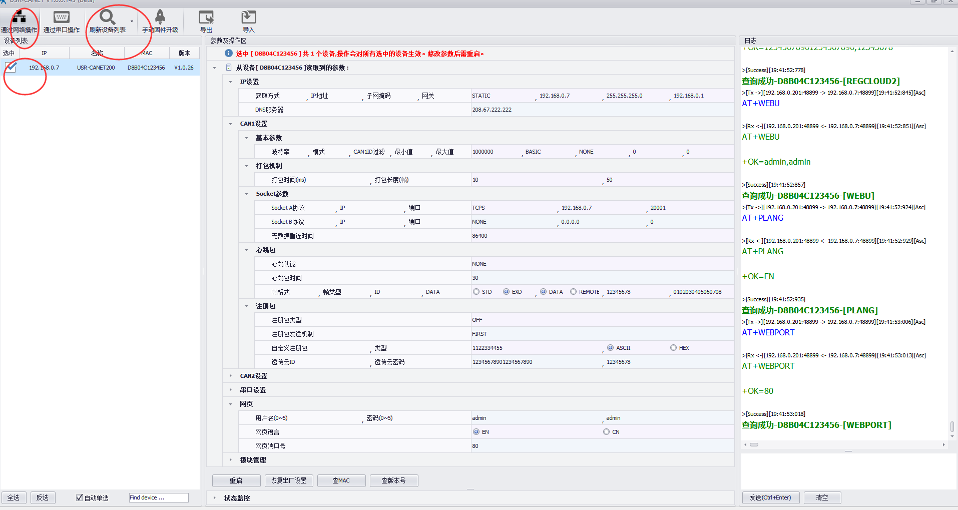 2.打開設(shè)置軟件:USR-CANET V1.0.0.143 (Beta),點(diǎn)擊通過“網(wǎng)絡(luò)操作”,然后點(diǎn)擊“刷新設(shè)備列表”,搜索到設(shè)備之后,勾選到相關(guān)的設(shè)備。設(shè)備的參數(shù)會刷新。