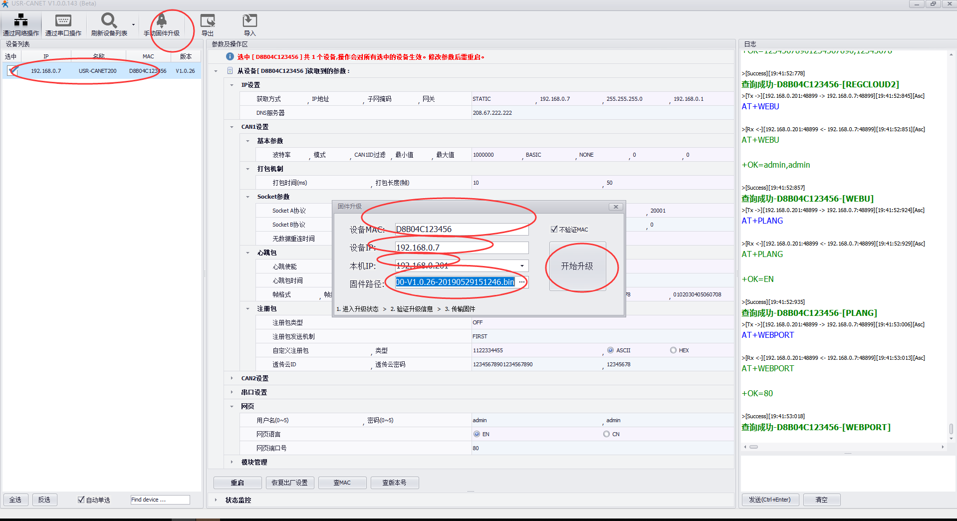USR-CANET200、標(biāo)準(zhǔn)電源適配器、所要升級的固件(可提工單獲取最新固件)、USR-CANET V1.0.0.143 (Beta)(設(shè)置軟件,用來固件升級的工具)。
