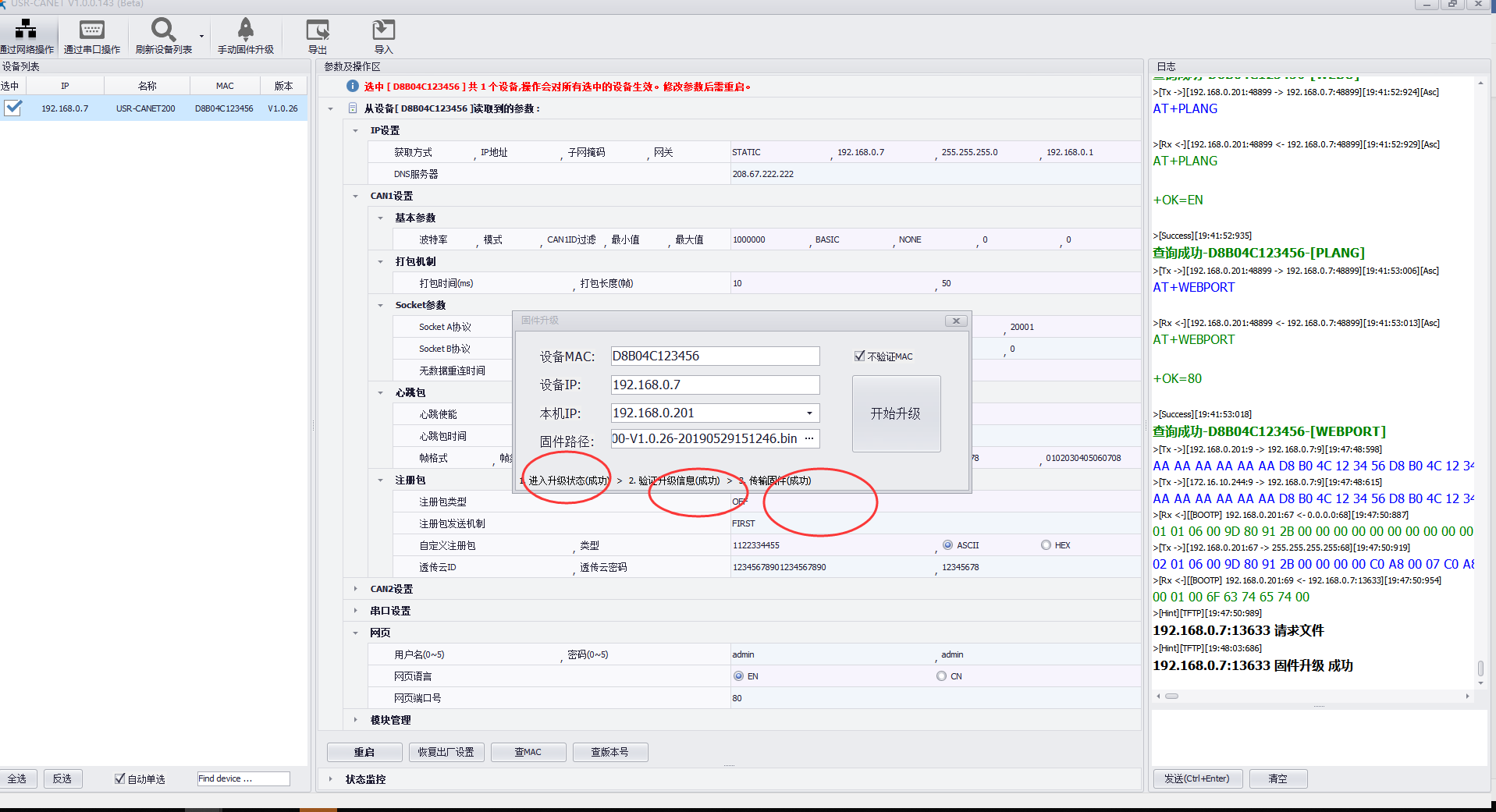 進(jìn)入升級狀態(tài)(成功)-驗(yàn)證升級信息(成功)-傳輸固件(成功)