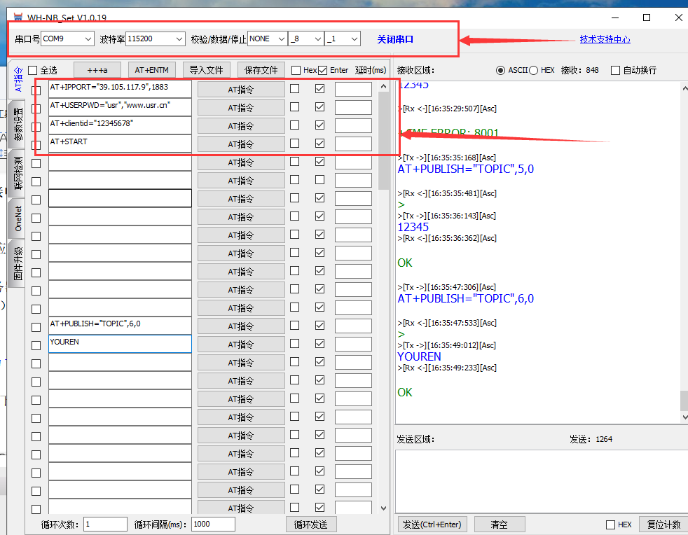 ①AT+IPPORT="39.105.117.9",1883(本次測試連接我司MQTT服務器)