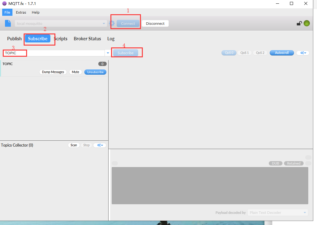 5. 返回MQTTfx主界面點擊connect,選擇Subscribe,輸入TOPIC,選中右側Subscribe,如下圖