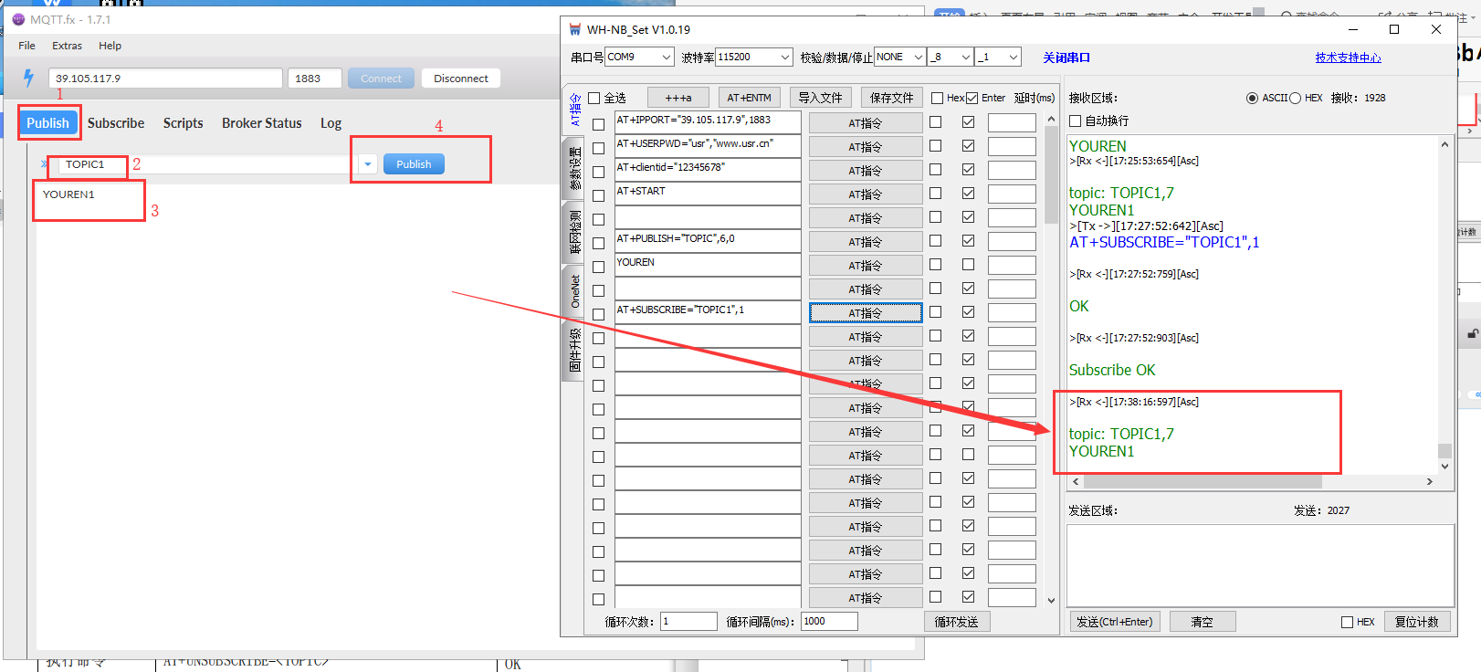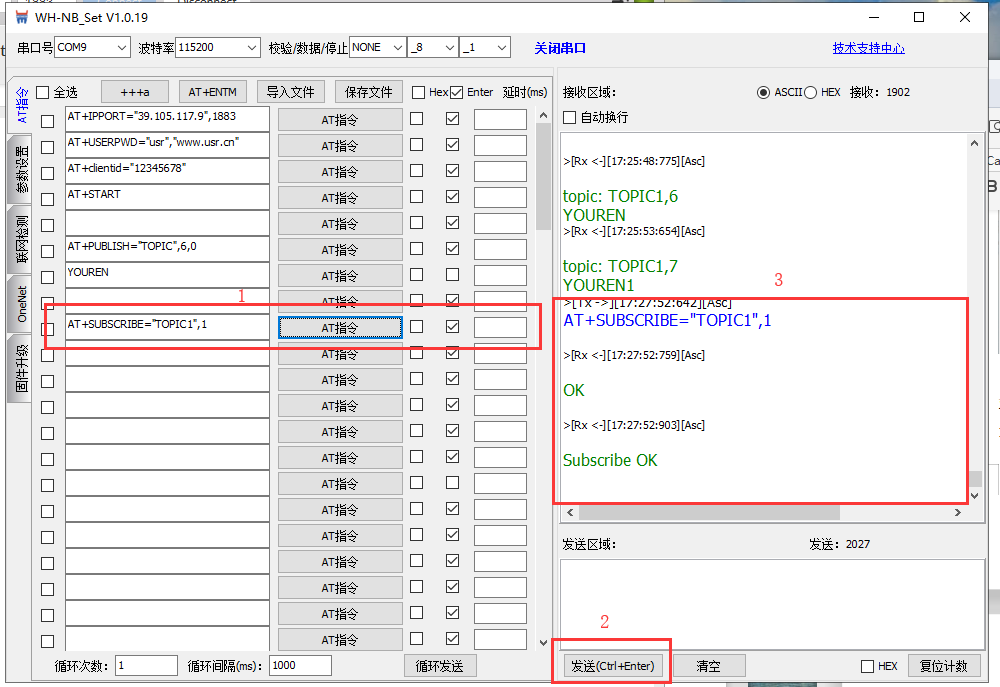 1. 在設置軟件輸入AT指令AT+SUBSCRIBE=”TOPIC1”,1