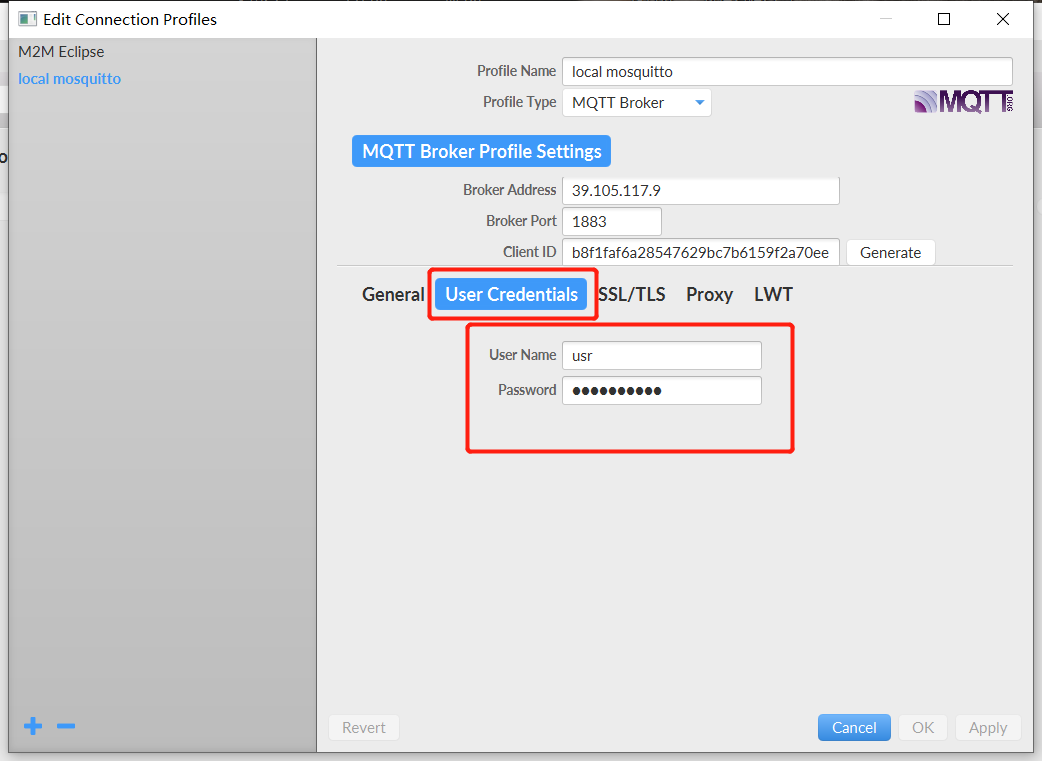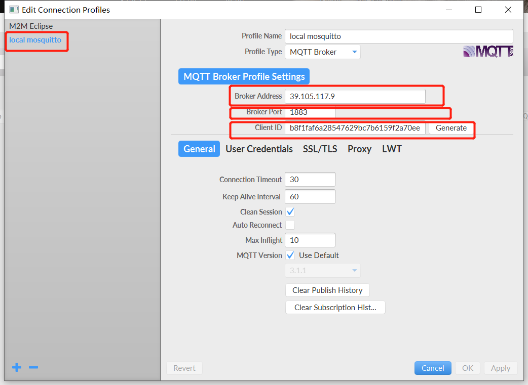 3. 打開MQTTfx,選擇Extras -> Edit Conneciont Profiles,填入圖中IP,端口和客戶機ID,點OK保存