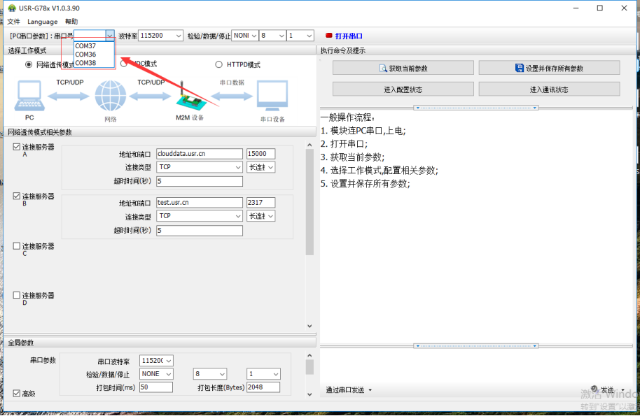 4.打開780軟件,打開上一步在設備管理器中進行查看,顯示的端口號為37和38,點一下軟件的串口號的下拉框,可以看到有三個串口號,也就是除了37和38兩個還有一個隱藏的,只是在設備管理器沒顯示,就選這一個沒顯示的串口號,波特率115200。