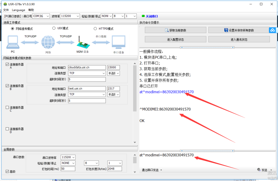 5. 打開串口,發送at^modimei=iemi的15位號碼,加回車,然后發送,如下圖所示